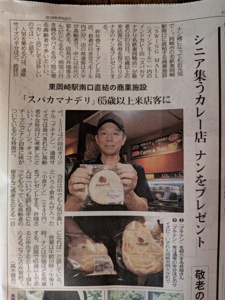 スバカマナ・デリ名鉄東岡崎店が、敬老の日に関連する企画として、新聞に取り上げていただきました!